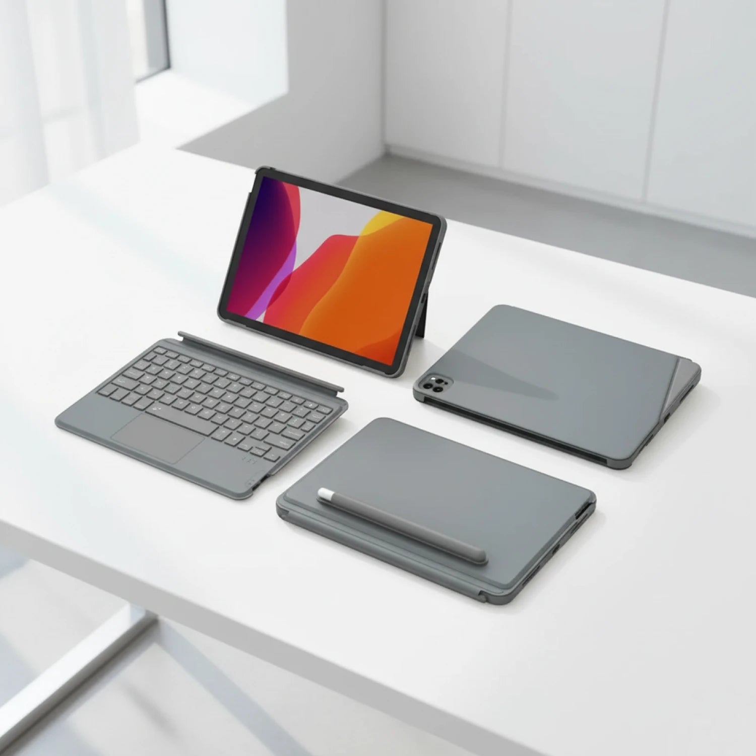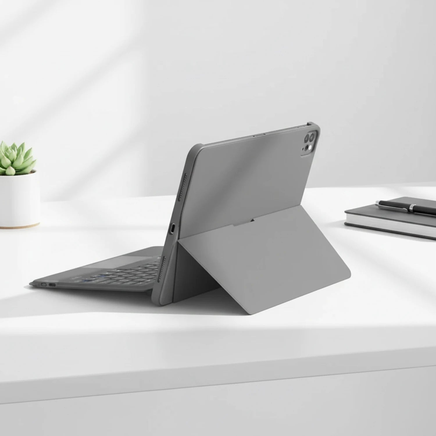 O teclado magnético é removível, permitindo alternar entre produtividade total e uso leve do iPad.